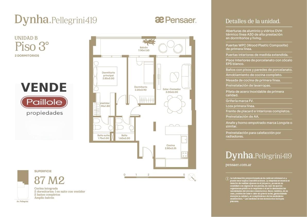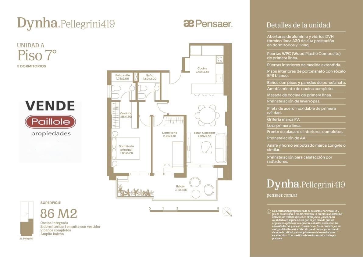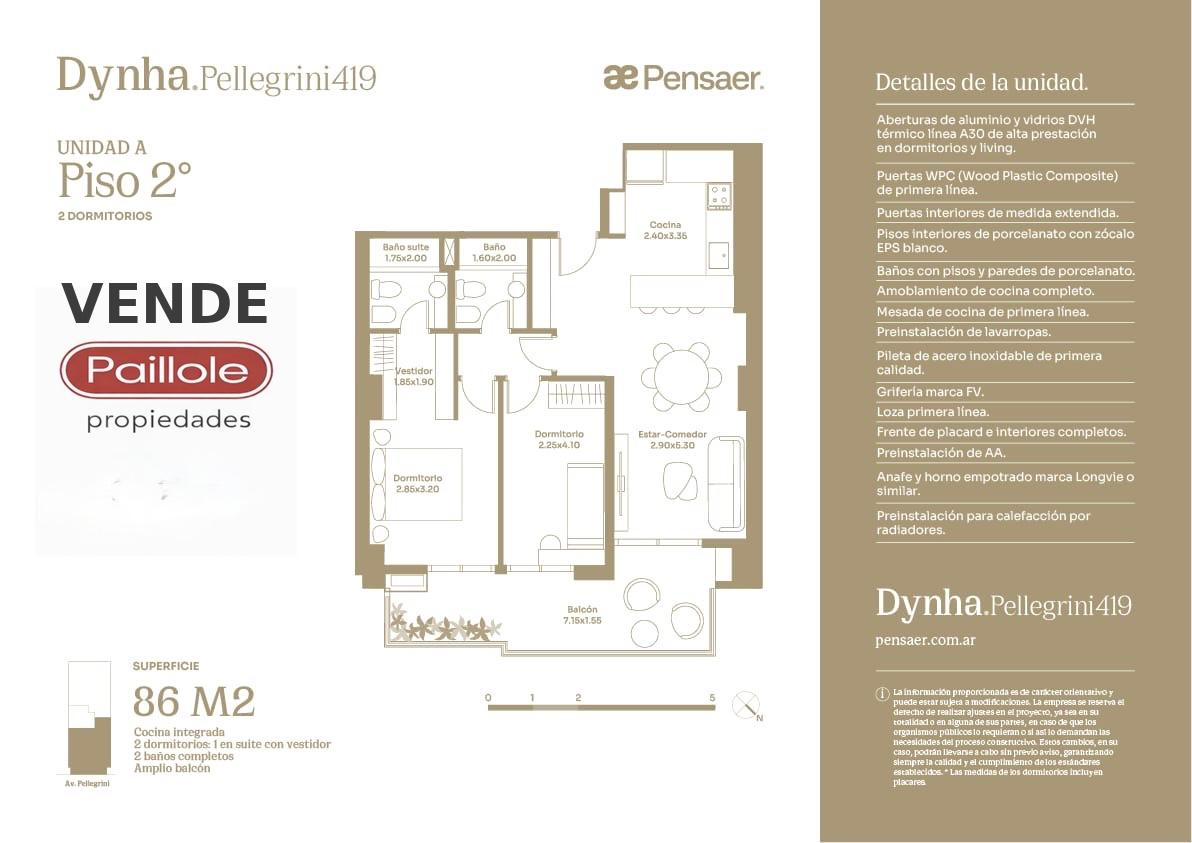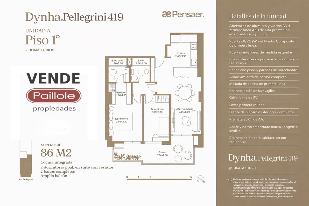 Las aberturas con vidrios DVH en dormitorios y living aseguran confort térmico y acústico, mientras que los balcones amplios, abiertos al Norte y al Sur, se proyectan hacia la ciudad y Av. Pellegrini, potenciando la perspectiva urbana.