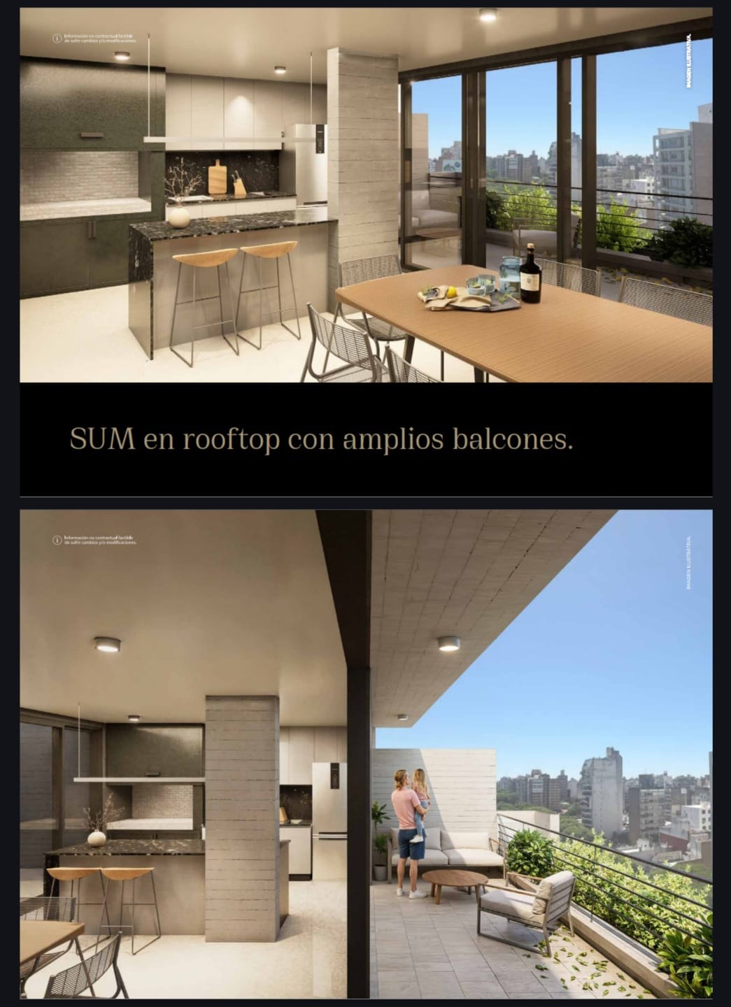 En el rooftop se desarrollan los amenities, diseñados para disfrutar de momentos compartidos, combinando espacios confortables con visuales abiertas a la ciudad y el río.